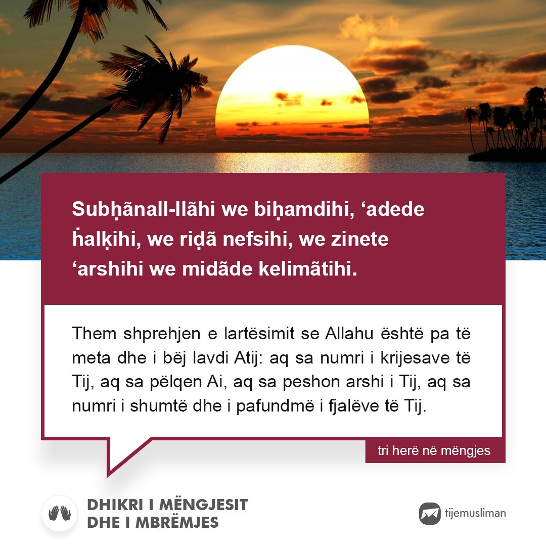 . Sahihu et-tergib uet-terhib 1283 Leximi i sures El-Ikhlas El-Felek dhe En-Nas tri herë. Dhikri i Mengjesit Sabahut الحمد لله وحده والصلاة والسلام على من لا نبي بعده Elhamdu lil-lahi vahdeh ves-salatu ves-selamu ala men la nebijje badeh Falënderimi i takon vetëm All-llahut mëshira dhe. April 24 2021.